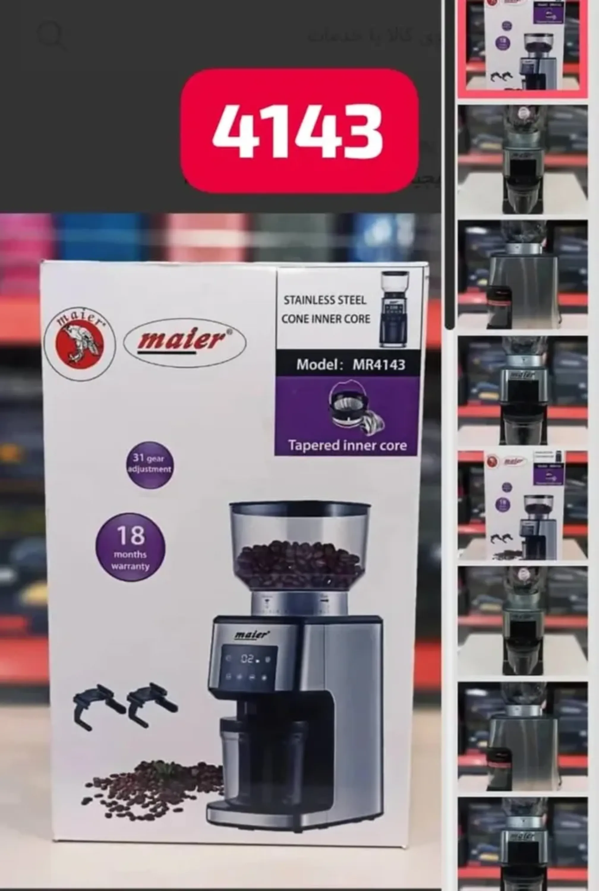معرفیمعرفی برند مایر توان مصرفی 200 وات مانیتور لمسی دارد پایه ضد لغزش دارد جنس بدنه استیل ضد زنگ ظرقیت قیف 350 گرم ظرفیت مخزن آسیاب 150 گر